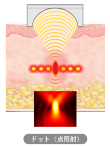 よく様々なクリニックで「ハイフでリフトアップ!」という施術が多いですが、そういった一般的なハイフのほとんどが以下の「ドット照射」になります。