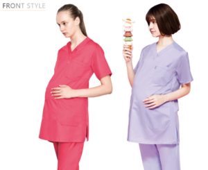 前開きタイプのマタニティスクラブです。前肩部分にタックが入っていて、お腹のゆとりがしっかり確保されています。
