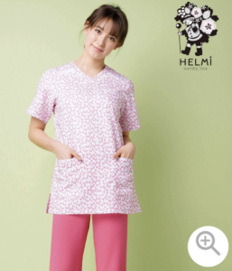 リバティーフラワープリントの上品な柄スクラブ。柄ですが派手すぎず、さりげない印象です。