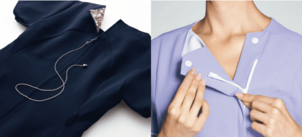 一般的なスクラブは肩にボタンが付いていて、頭からかぶって着るため、髪型くずれやファンデーションが付着する心配があります。